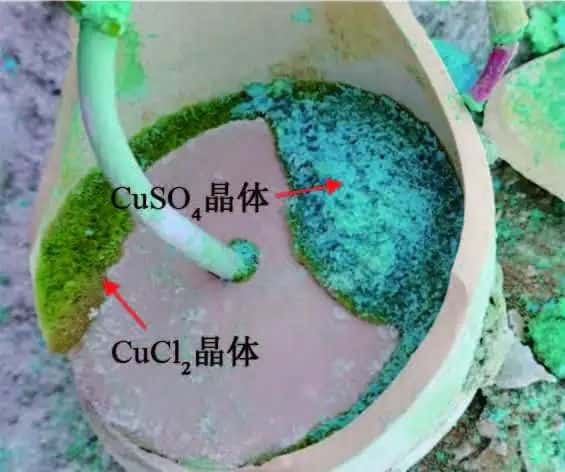 柴达木盆地的盐渍土分布广泛,根据土壤检测结果,主要特点如下:戈壁、沙漠等极干燥土壤中含盐量相对较低,一般小于10%;低洼湿润或干湿交替土壤中含盐量高,一般为10%~45%,最高甚至可达80%。失效的硫酸铜长效参比电极形貌如图1所示,电极内溶液已干涸,底部析出蓝色硫酸铜晶体和黄绿色氯化铜晶体,表明此电极在使用过程中,土壤中的大量氯离子渗透进入了参比电极内部。氯离子渗透进入长效参比电极腔体的速度和含量取决于土壤中氯离子含量、土壤湿润程度、土壤性质和土壤干湿变化情况。柴达木盆地中大量盐湖和低洼盐碱区的土壤盐含量高、地下水位高,部分位置管道甚至浸泡在饱和盐水中,氯离子污染程度最高。
