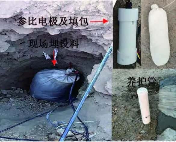 在青海油田管道阴极保护系统新建和修复过程中,按照优化的方法开展长效参比电极的更换。如图4所示,参比电极本体为孔隙陶瓷材质,包覆在填料中进行埋设。同时设置养护管,一端埋设在填料中,一端露出地面,用于浇水养护。